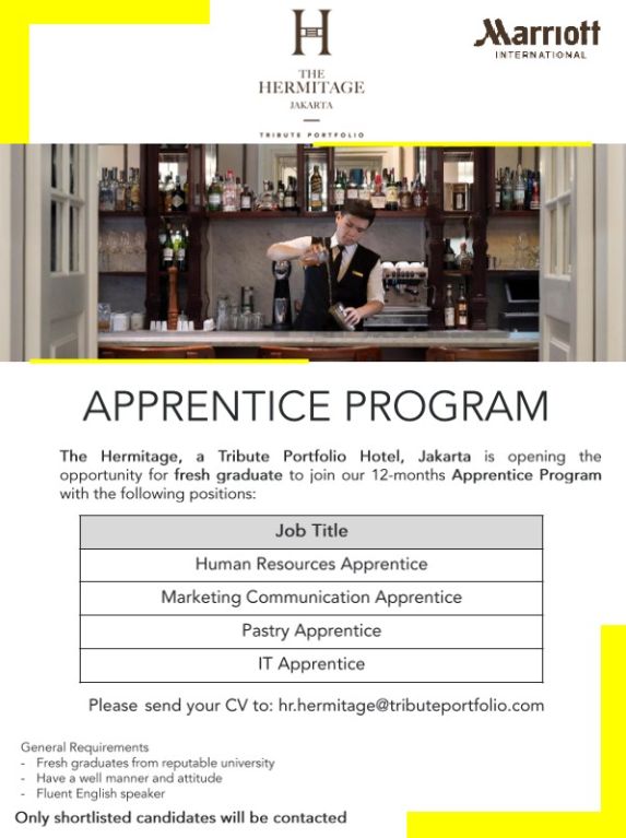The Hermitage, a Tribute Portofolio Hotel, Jakarta is opening the opportunity for fresh graduate to join our 12-months Apprentice Program with the following positions :
