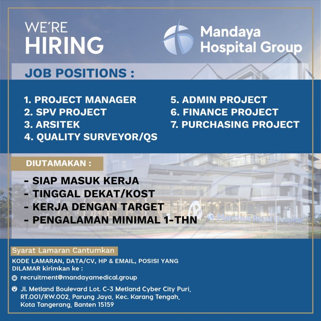 Mandaya Royal Hospital Puri (MRHP) dikelola oleh Mandaya Hospital Group, anak perusahaan Selaras Holding Group di bidang kesehatan, yang merupakan perusahaan multi-industry dengan pertumbuhan yang cepat dan pesat dengan fokus utama di bidang pembangunan properti, hospitality, dan pelayanan kesehatan dirancang untuk menjadi rumah sakit swasta terbesar di Indonesia. Berikut ini adalah Lowongan Kerja Mandaya Royal Hospital Group.